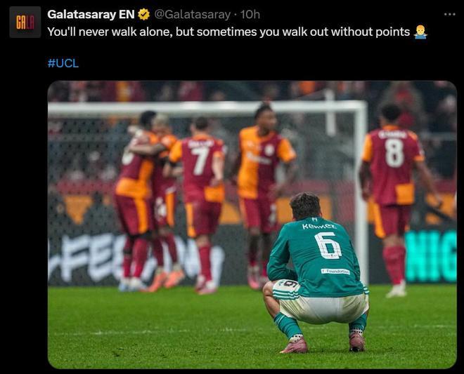 欧冠联赛阶段第二轮,利物浦客场0比1不敌加拉塔萨雷。赛后,加拉塔萨雷在社交媒体上以戏仿利物浦经典队歌的方式写道:“你永远不会独行,但有时你会空手而归”。